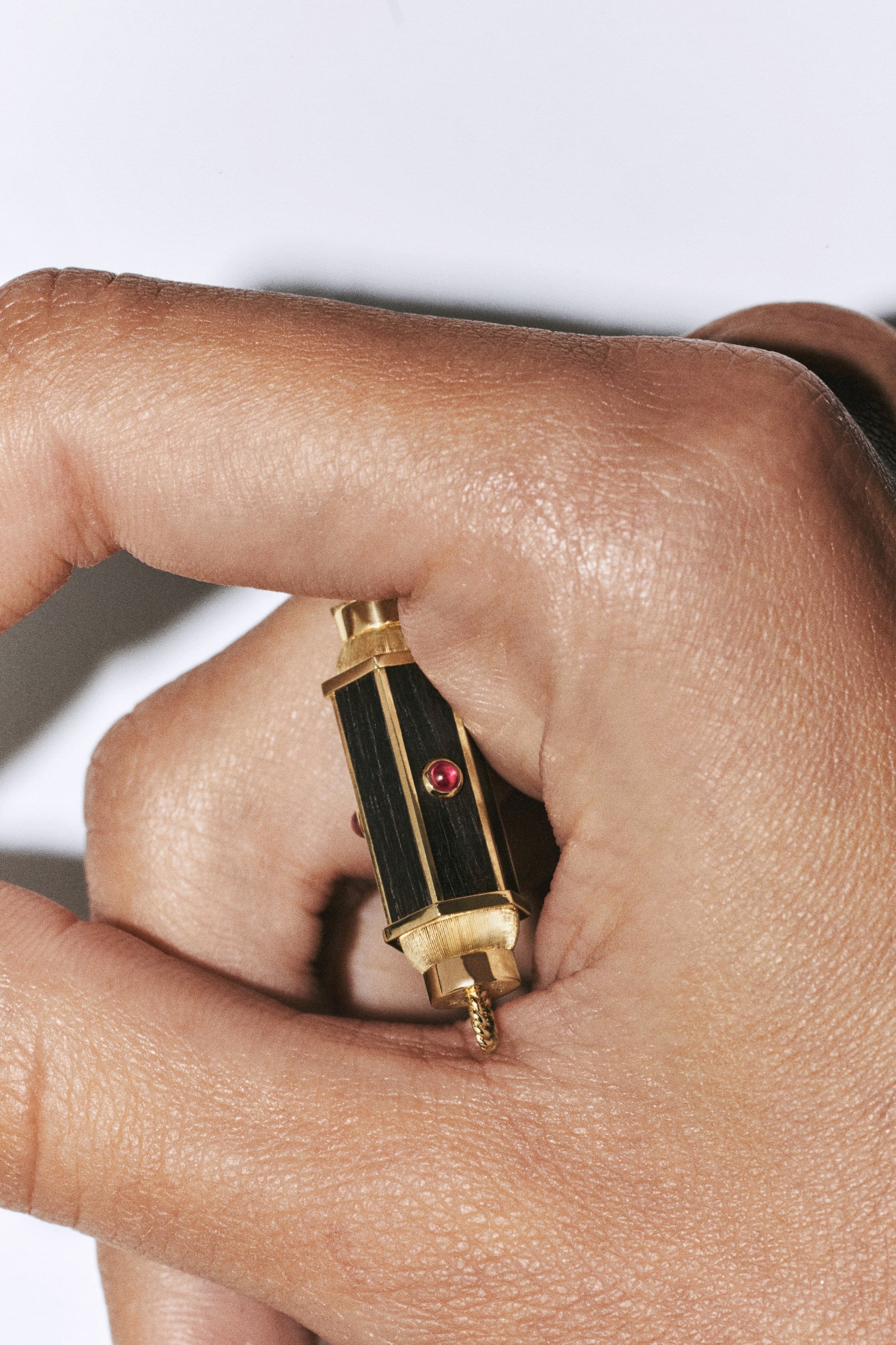 Thin gold pendant barrel, adorned with ebony and set with a ruby.