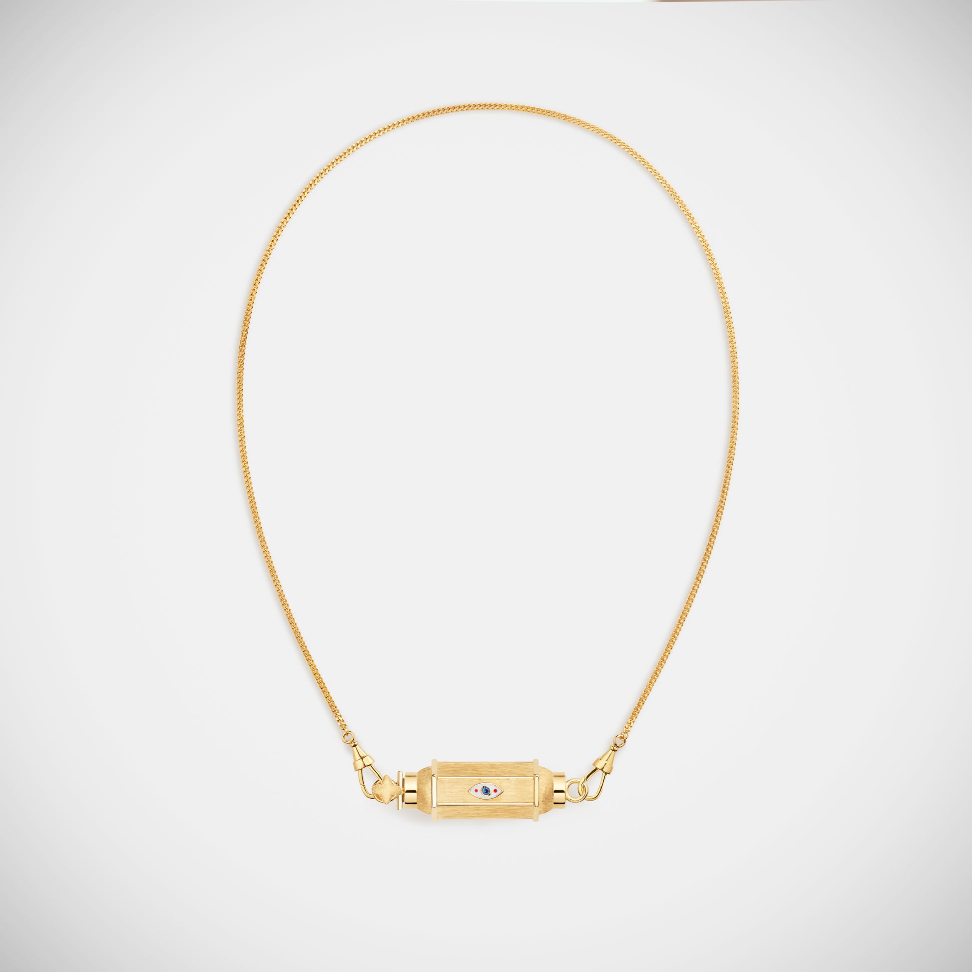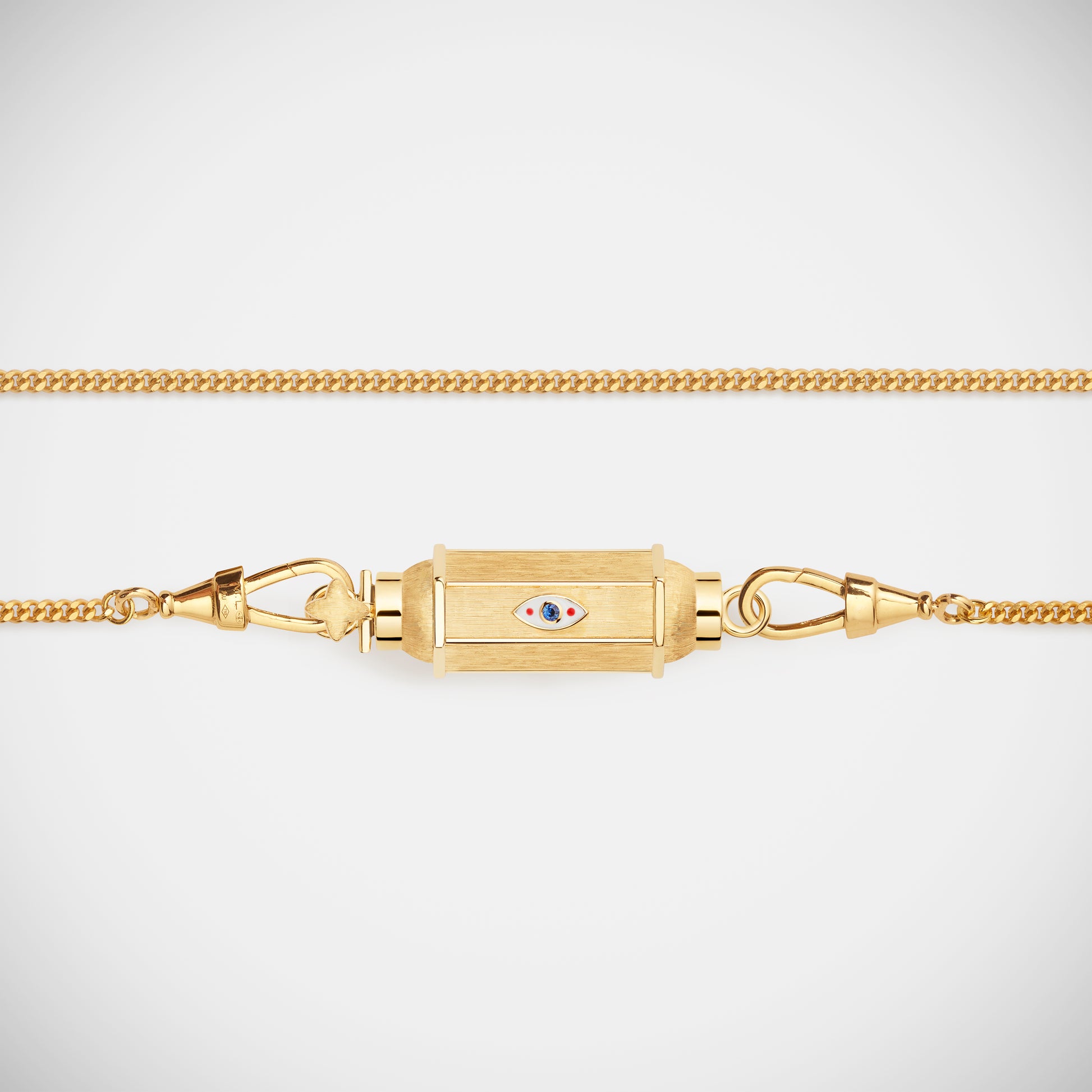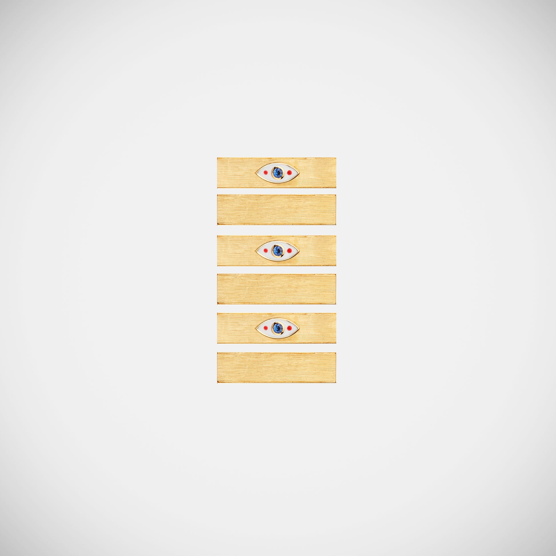 Thin barrel pendant in yellow gold, adorned with three enameled evil eyes, each containing one blue sapphire.
