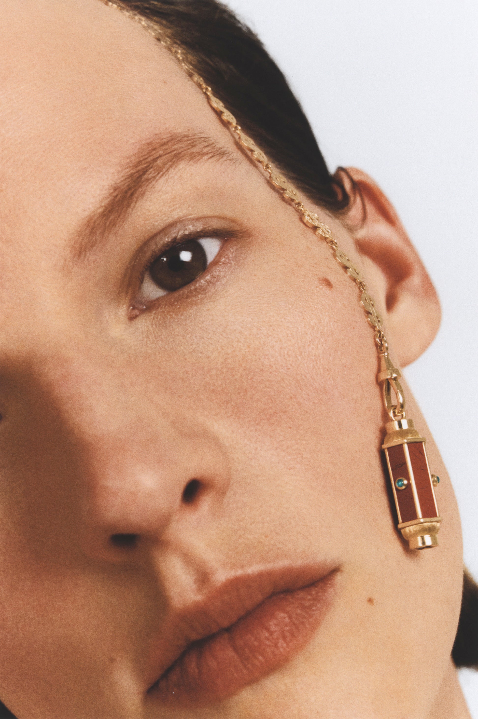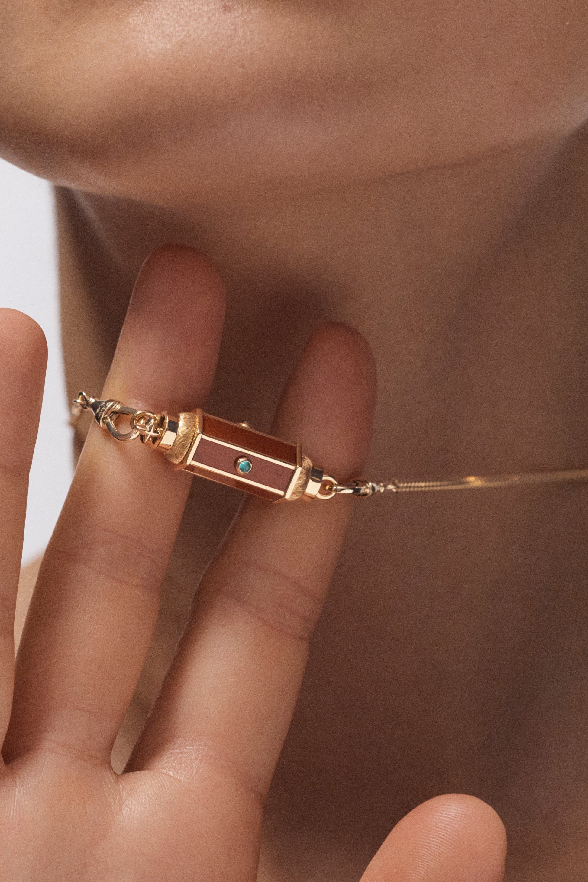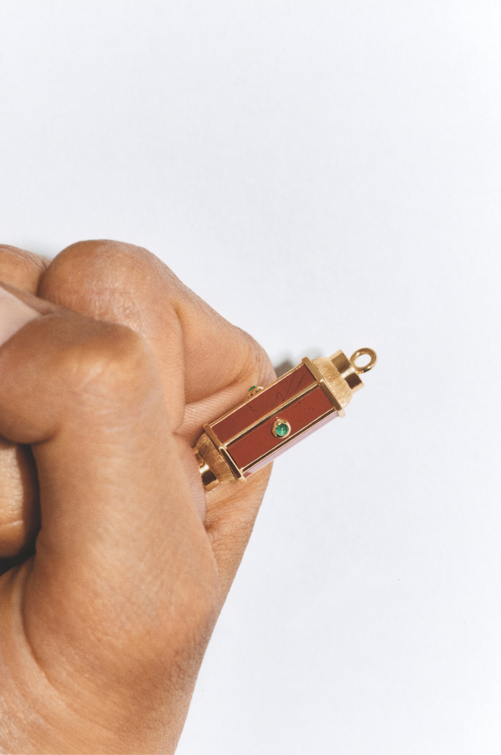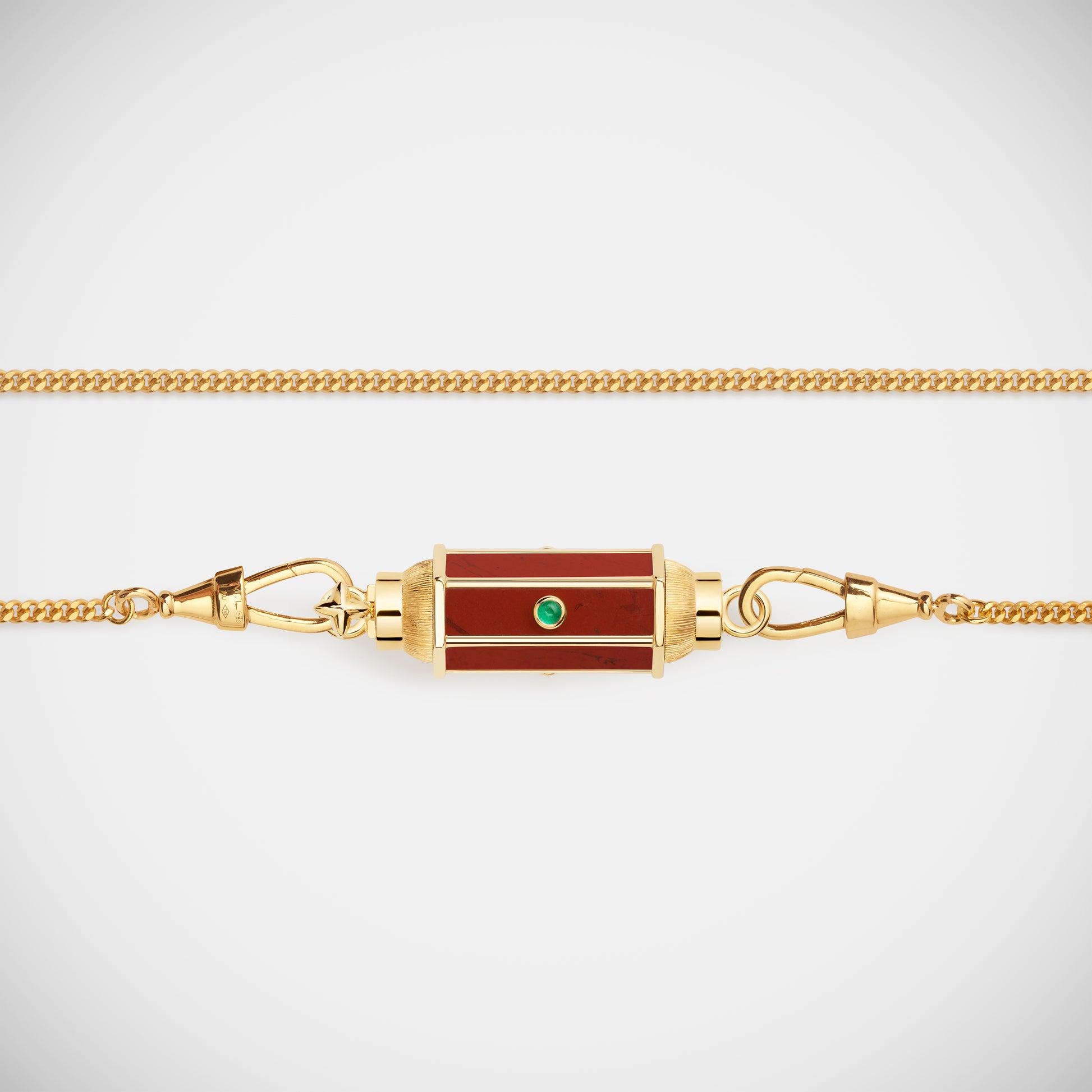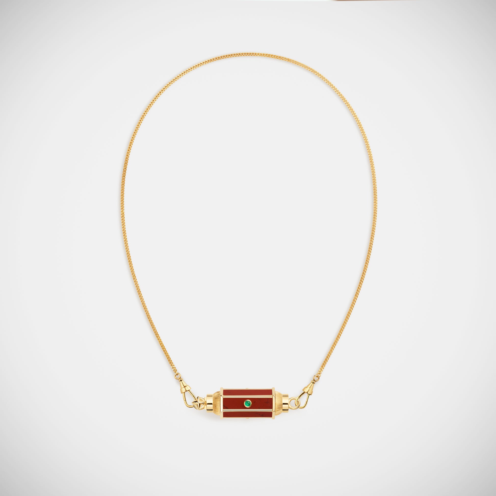 Thin hand-brushed gold pendant barrel, set with jasper and three emeralds.