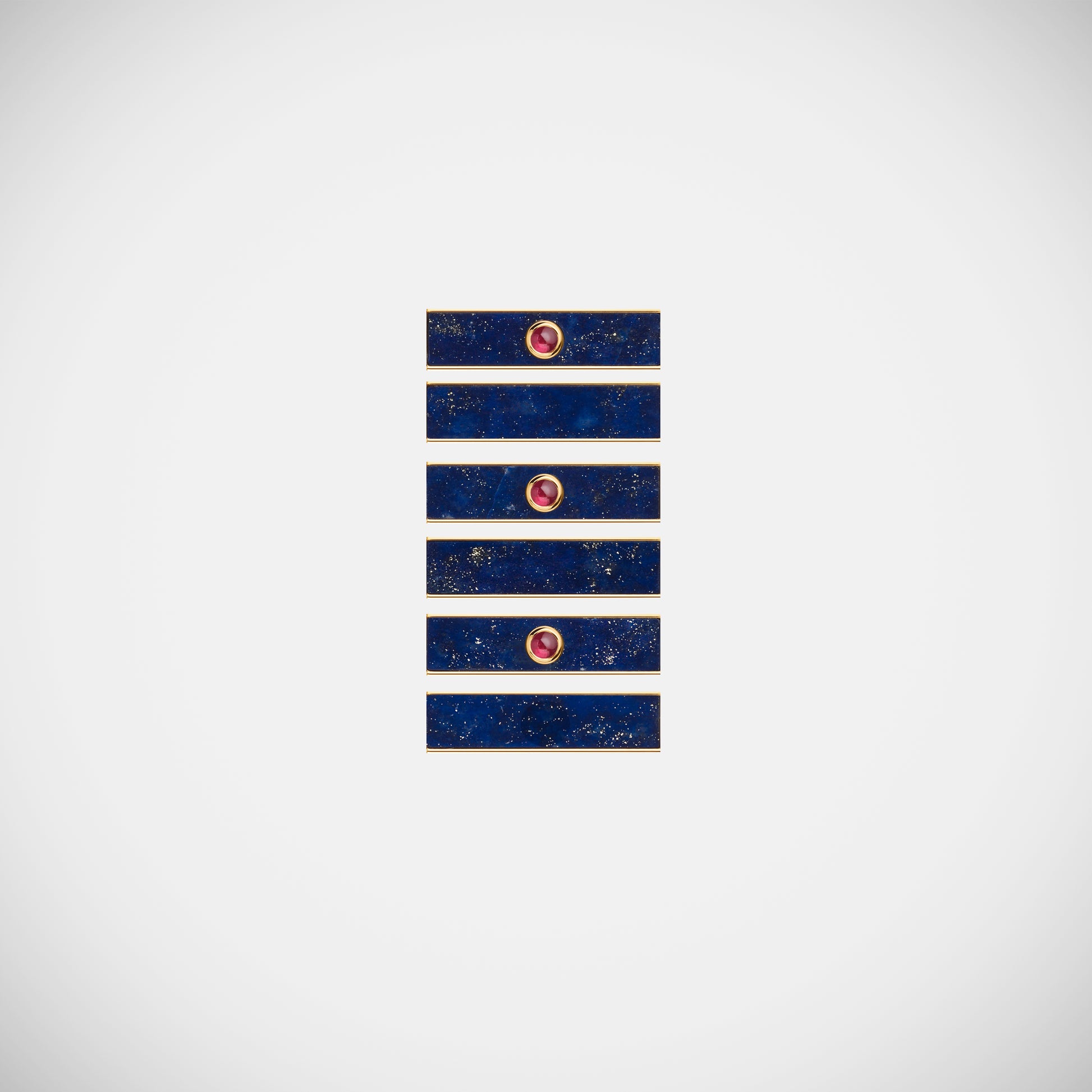 Thin hand-brushed gold pendant barrel, set with lapis and three rubies.