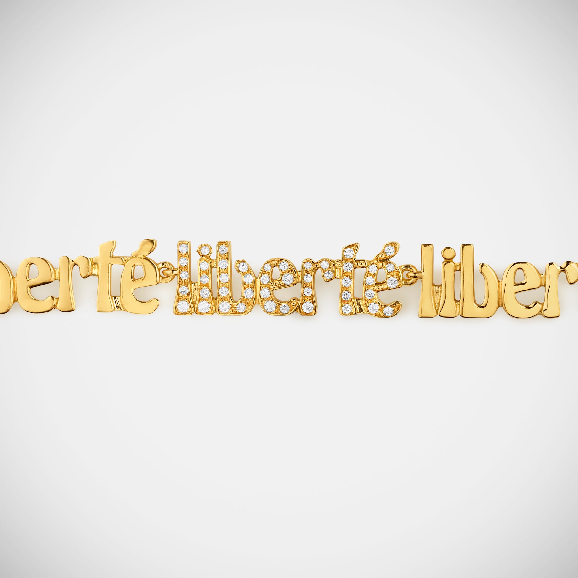 Yellow gold letter chain, set with white diamonds, reading "LIBERTÉ", which means "Freedom" in french.