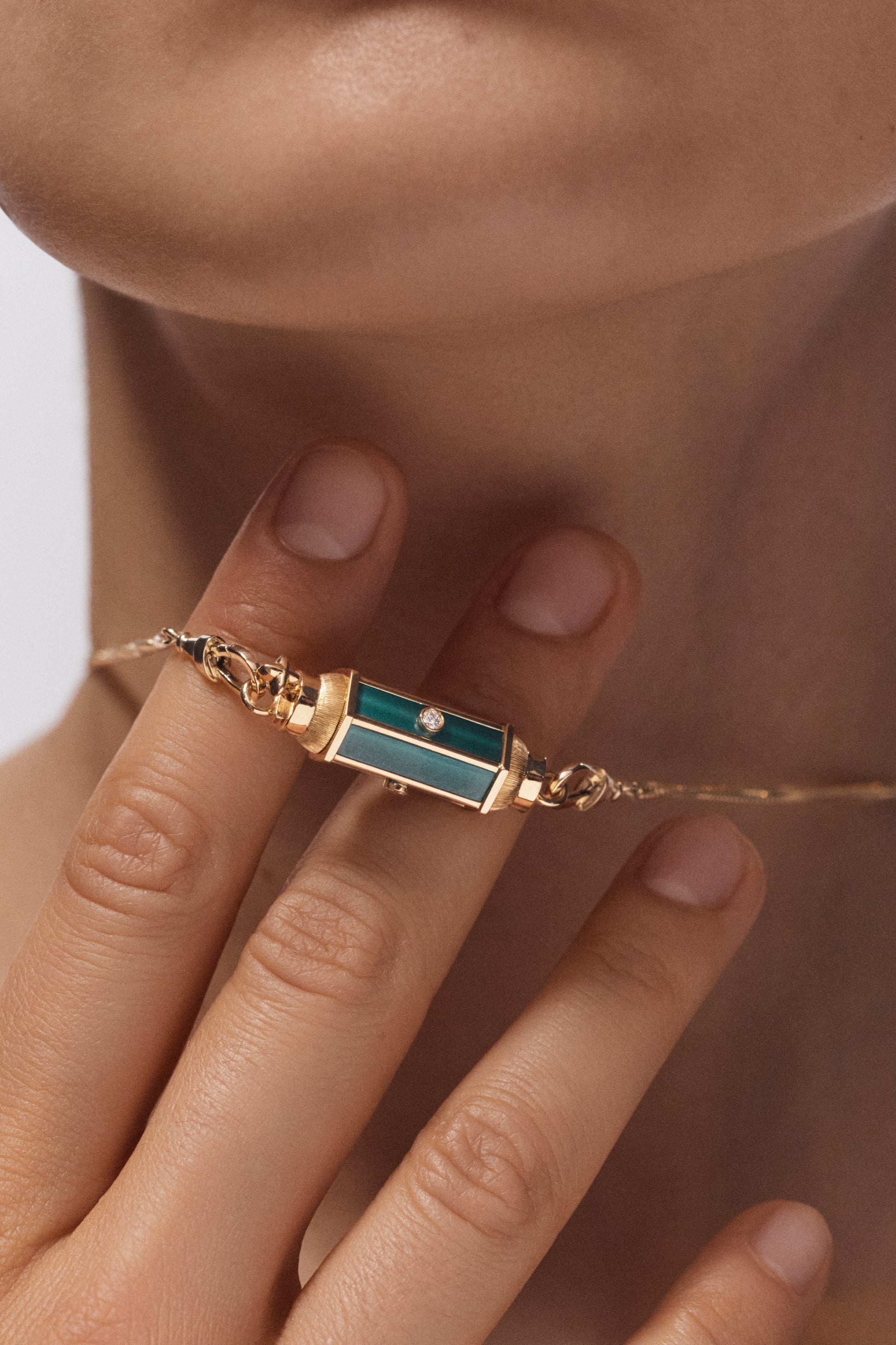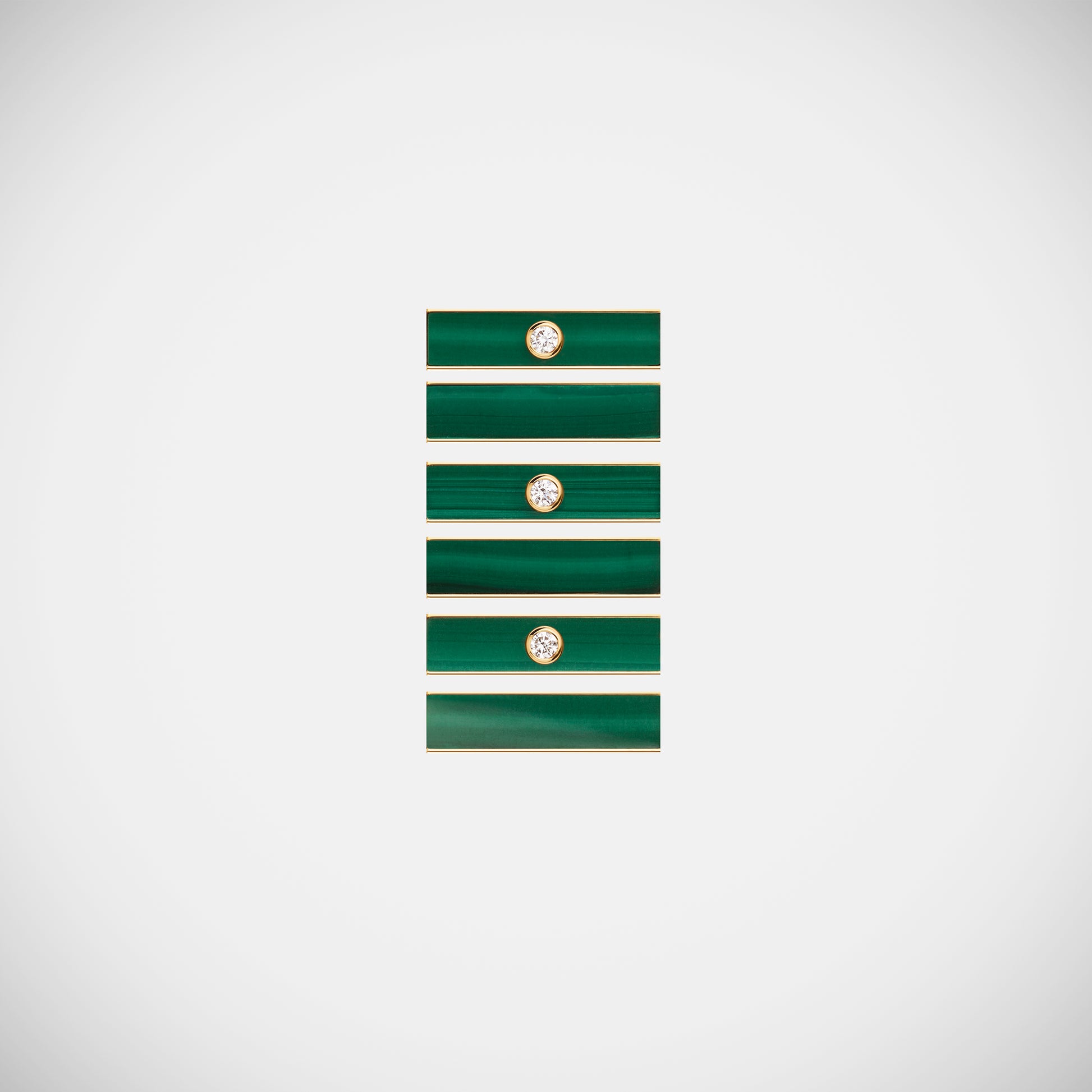 Thin hand-brushed gold pendant barrel, set with malachite and three diamonds.